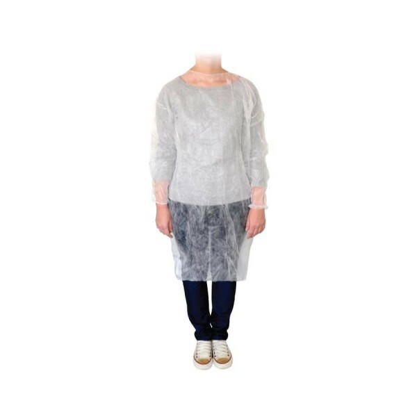 Avental confeccionado em TNT (Tecido Não Tecido), manga longa, elástico nos punhos e tiras nas costas.