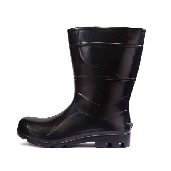 Sua alta proteção se deve à confecção em Policloreto de Vinila (PVC), material resistente e maleável, além do desenho do cabedal tipo (D), proporcionando uma proteção mais extensa da perna, montagem sistema de injeção por extrusão e solado monodensidade com ressaltos.