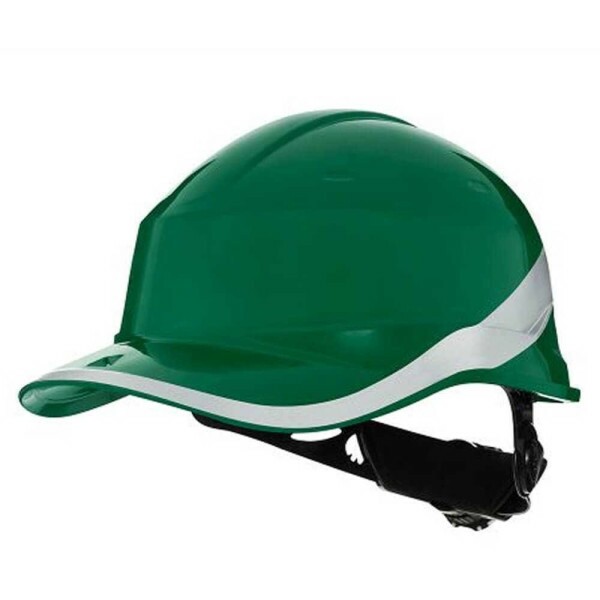 Capacete Classe A e B Verde com Carneira de Catraca e Faixa Refletiva Baseball Diamond V - Delta Plus | CA - 39041 destaca-se por seu design exclusivo, elegante e inovador. Desenvolvido pela renomada marca DELTA PLUS, este capacete é confeccionado em ABS, garantindo alto brilho, durabilidade superior e isolamento elétrico de até 30 kV. Com uma faixa exclusiva para aumentar a visibilidade e uma aba frontal que oferece uma visão vertical ampliada, é ideal para trabalhos em altura.