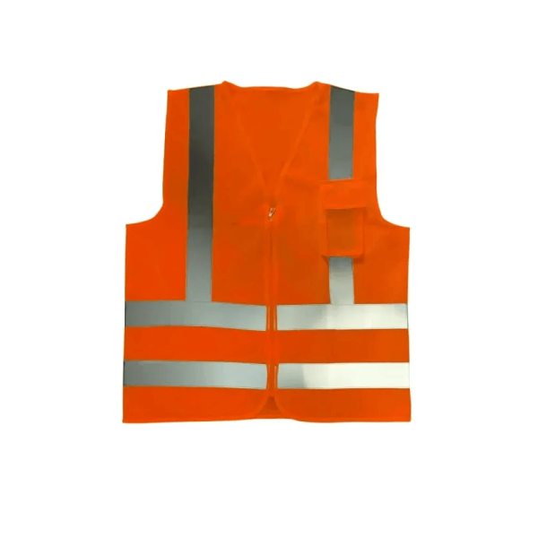 O Colete Refletivo Dia e Noite com 1 Bolso Laranja - Volk é confeccionado em tecido sintético de poliéster fluorescente, garantindo durabilidade e resistência. As faixas refletivas, presentes na área do tórax e em formato X nas costas, refletem a luz, tornando o usuário mais visível em ambientes com baixa luminosidade. O fechamento frontal em zíper e o bolso adicionam funcionalidade ao design, permitindo que o usuário carregue pequenos objetos de forma prática e segura.