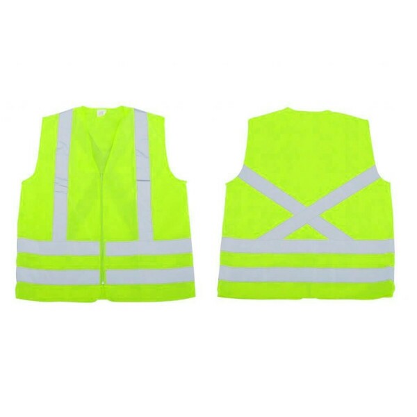 Colete de sinalização de alta visibilidade, confeccionado em tecido fluorescente 100% poliéster, combinado com faixas retrorrefletivas repelentes de água em X com paralelas horizontais nas costas, verticais e horizontais na parte frontal, fechamento frontal em zíper.