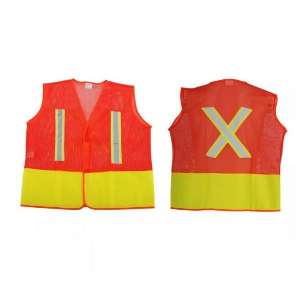 Colete de sinalização de alta visibilidade, confeccionado em tecido fluorescente 100% poliéster, combinado com faixas retrorrefletivas repelentes de água em X nas costas, paralelas na parte frontal e fechamento frontal em velcro.