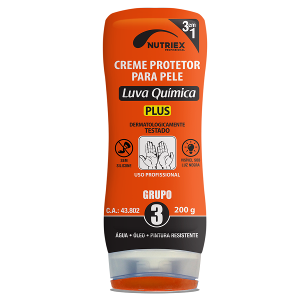 Creme protetor do grupo 3 - especial que aplicado à pele forma uma película protetora invisível contra os ataques de produtos, tais como: água, tolueno, xileno, benzina, querosene, aguarrás, thinner, metiletilcetona/MEK, gasolina, óleo mineral, óleo diesel, acetona, pós em geral, percloroetileno, cloreto de metileno, tintas (tinta base água, tinta à base de óleo, tinta base solvente, tintura de jeans), adesivos (adesivo base água, adesivo base solvente) (cola de sapateiro, cola, cola instantânea), ácido acético 10%, ácido clorídrico 15%, ácido clorídrico 30%, ácido fosfórico 15%, ácido sulfúrico 15%, hidróxido de sódio 10%, hidróxido de sódio 20%, nhexano, negro de fumo, lã de vidro, mistura de cimento: areia e água, argamassa, cal a 4%, nujol, graxas em geral (graxa suja, graxa grafitada, graxa seca), tricloroetileno, clorofórmio, acetato de etila, formaldeído, resinas, álcool isopropílico, sem que o usuário perca a sensibilidade ao tato.