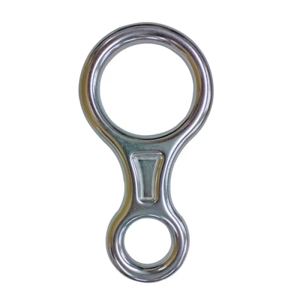 Freio oito simples em liga de alumínio, 35 kN, utilizado em corda Ø entre 9 e 12 mm.