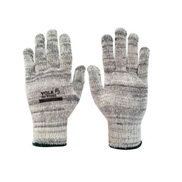 Luva de segurança confeccionada em fibras naturais e fibras sintéticas (poliéster) punho com inserção de fibras elásticas, acabamento em fibras sintéticas.