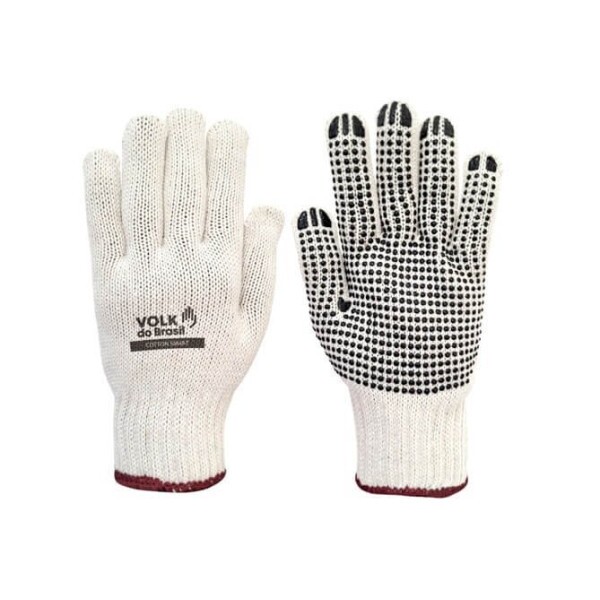 Luva de segurança confeccionada em fibras naturais e fibras sintéticas (poliéster), com pigmentos de policloreto de vinila (PVC) na palma, punho com inserção de fibras elásticas, acabamento em fibras sintéticas