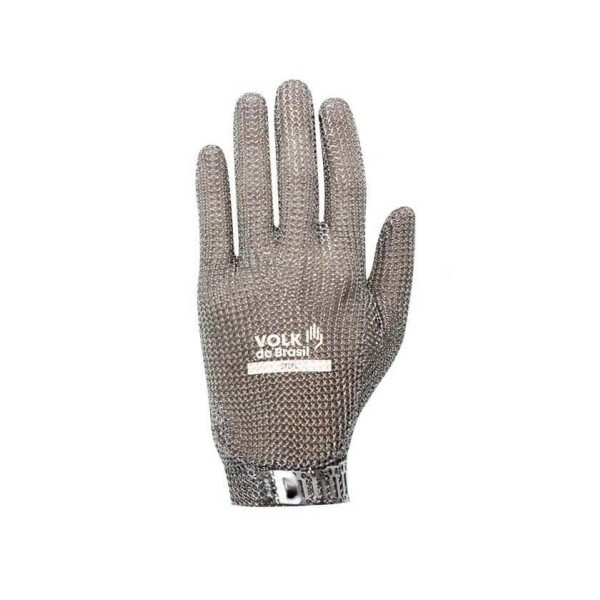 Luva de segurança confeccionada em malha de aço inoxidável, fio com diâmetro de 0,55 mm e anéis com diâmetro interno de 2,9 mm e externo de 4,0 mm com pulseira malha aço inox para fechamento e ajuste no punho, curta, cinco dedos.