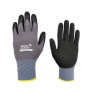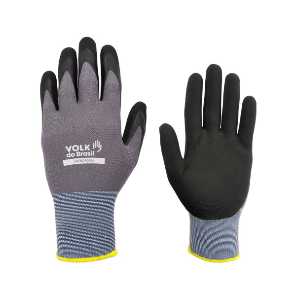 Luva de segurança confeccionada em nylon ® e fibras sintéticas, 15 gauge, revestimento da face palmar e ponta dos dedos em nitrila tipo foam, punho com inserção de fibras elásticas, acabamento em fibras sintéticas.