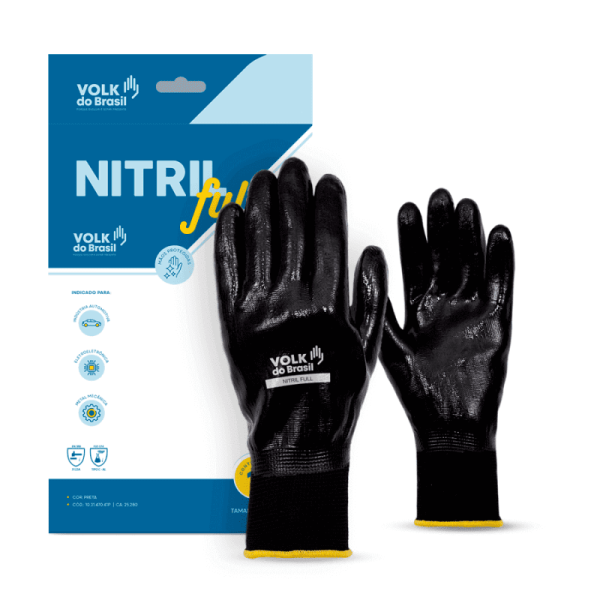 Luva de segurança confeccionada em fibras sintéticas, totalmente revestida com nitrila, lisa, punho em fibras elásticas e acabamento em fibras sintéticas.