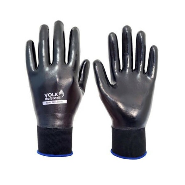 Luva de segurança confeccionada em fibras sintéticas, 13 gauge, revestida com nitrila lisa, punho em fibras elásticas e acabamento em fibras sintéticas.