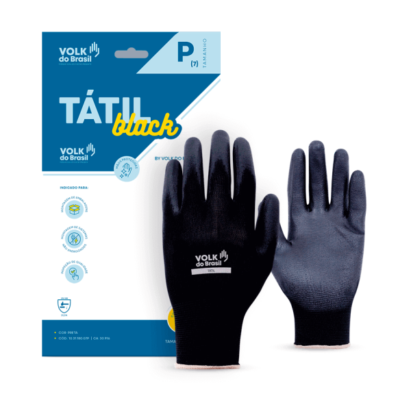 Luva de segurança confeccionada em fibras sintéticas, revestimento da face palmar e ponta dos dedos em poliuretano (PU), punho com inserções de fibras elásticas e acabamento em fibras sintéticas.