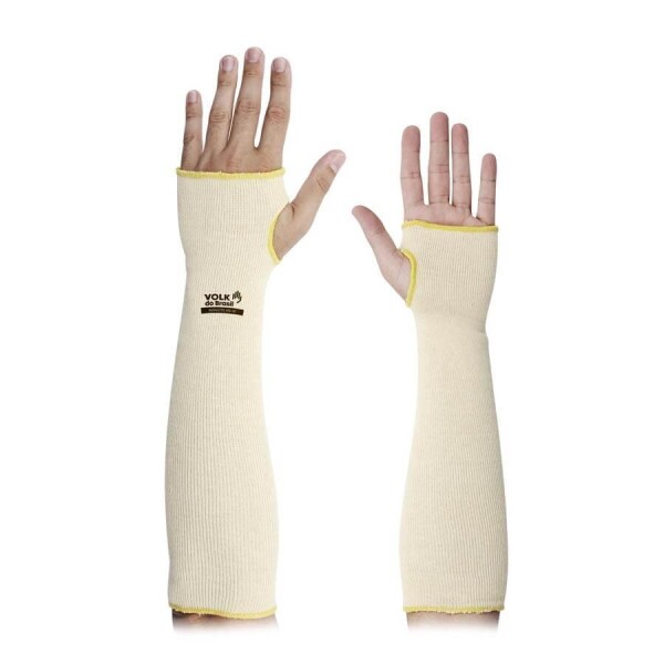 Manga de segurança tricotada em fios de aramida, sem costura, ambidestra, orifício na parte inferior da manga para encaixe do polegar.