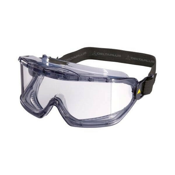 Óculos ampla visão em policarbonato. Proteção lateral, UV-400 (UVA e UVB), antirrisco, antiembaçante e antirreflexo. Armação flexível em PVC e Nylon com ventilação indireta. Adaptado para uso com óculos de grau e máscaras respiratórias descartáveis. Amplo elástico inclinável.
