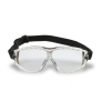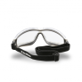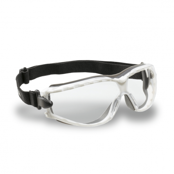Óculos de proteção, modelo ampla-visão, constituído de armação confeccionada em uma única peça de plástico rígido na cor branca recoberta internamente com borracha termoplástica macia cinza, sistema de ventilação indireta composto de dezoito fendas, sendo dez na parte superior e oito na parte inferior da armação, ajuste através de tirante elástico preto com regulagem de tamanho encaixado nas laterais do visor por meio de presilhas plásticas que permitem a movimentação angular. Vantagens Tratamento Antirrisco