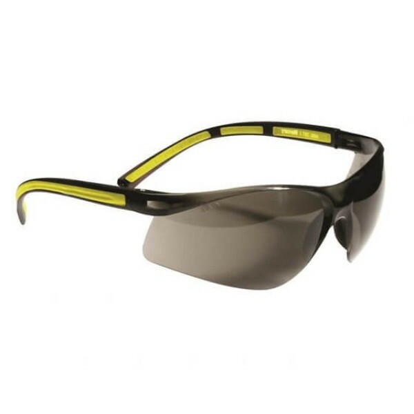 Óculos de segurança com lente de proteção em policarbonato com tratamento antirrisco, antiembaçante e UV, protetor nasal injetado do mesmo material e haste emborrachada.