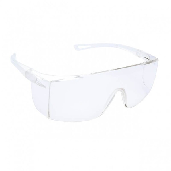 Óculos de segurança, com armação e visor confeccionado em uma peça de policarbonato, com proteção lateral e meia proteção na borda superior injetada na mesma peça.