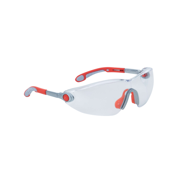 Óculos de segurança constituídos de armação e visor confeccionados em uma única peça de policarbonato, apoio nasal em PVC macio, hastes inclináveis em Nylon e semi-haste vazada em material plástico e PVC macio que permite o ajuste do tamanho.