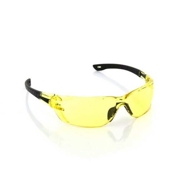 Óculos de segurança constituídos de armação e visor confeccionados em uma única peça de policarbonato com quatro pinos localizados na posição do nariz. Utilizados para encaixe do apoio nasal confeccionado em resina termoplástica maleável, hastes tipo espátula confeccionadas em duas peças fixadas à extremidade do visor por meio de dois pinos plásticos.