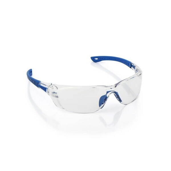 Óculos de segurança constituídos de armação e visor confeccionados em uma única peça de policarbonato com quatro pinos localizados na posição do nariz. Utilizados para encaixe do apoio nasal confeccionado em resina termoplástica maleável, hastes tipo espátula confeccionadas em duas peças fixadas à extremidade do visor por meio de dois pinos plásticos.