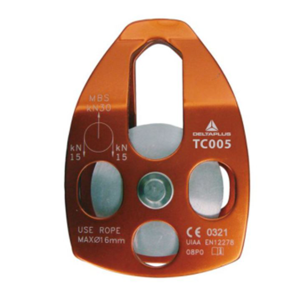 Polia simples com placas oscilantes em liga de alumínio para corda Ø inferior à 16 mm, cargade ruptura 30 KN.