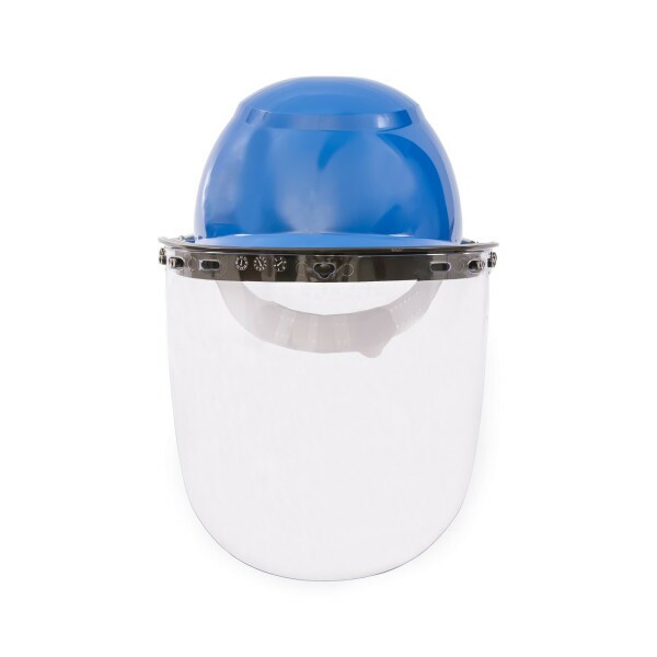 Protetor facial com capacete constituído de visor confeccionado em policarbonato incolor fixado através de cinco pinos plásticos em suporte basculante confeccionado de material plástico preto em forma de arco que se encaixa na aba do capacete, onde nas extremidades desse suporte é fixada uma mola metálica com uma parte revestida de borracha que passa pela parte traseira do casco do capacete e mantém o suporte fixo e ainda um capacete injetado em uma única peça de polietileno de alta densidade, não sendo condutor de corrente elétrica, ideal para trabalhos com eletricidade.
