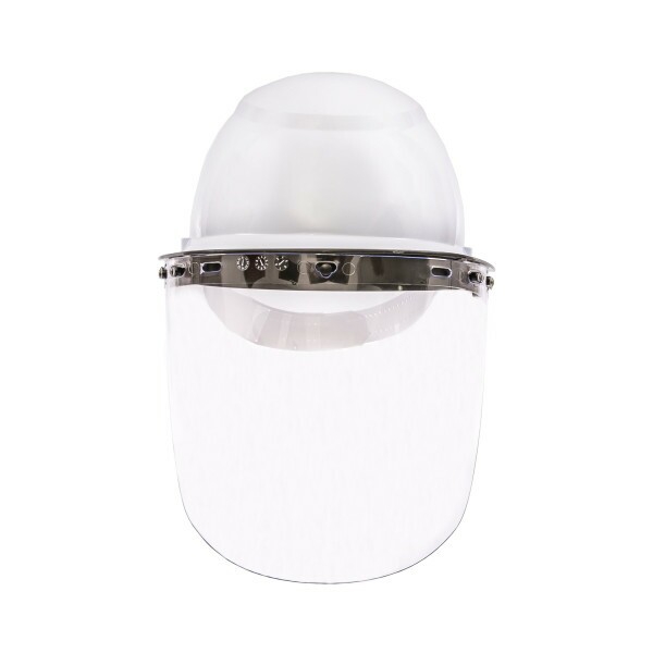 Protetor facial com capacete constituído de visor confeccionado em policarbonato incolor fixado através de cinco pinos plásticos em suporte basculante confeccionado de material plástico preto em forma de arco que se encaixa na aba do capacete, onde nas extremidades desse suporte é fixada uma mola metálica com uma parte revestida de borracha que passa pela parte traseira do casco do capacete e mantém o suporte fixo e ainda um capacete injetado em uma única peça de polietileno de alta densidade, não sendo condutor de corrente elétrica, ideal para trabalhos com eletricidade.