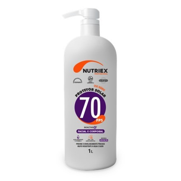 O Protetor Solar FPS 70 Facial E Corporal Nutriex Profissional amplo espectro oferece muito alta proteção à pele contra os efeitos nocivos da radiação solar, prevenindo as queimaduras solares. Com toque seco e fácil espalhabilidade, não deixa a pele esbranquiçada e possui aplicação rápida e prática. Contém Bioactive E®, poderoso antioxidante que previne o envelhecimento precoce. Além disso, minimiza os danos na pele causados pelos raios infravermelhos devido à ação antioxidante do produto. RÁPIDA ABSORÇÃO, TEXTURA LEVE, NÃO COMEDOGÊNICO, LIVRE DE CORANTES, AÇÃO HIDRATANTE. USO PROFISSIONAL.