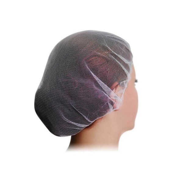 Touca confeccionada com fios de poliamida e elástico costurado (em overloque) na extremidade.