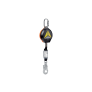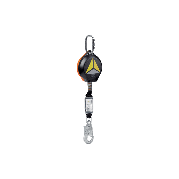 Trava-quedas retrátil com fita em poliéster de 6 metros de comprimento e 25 mm de largura, com absorvedor de energia. composto pelos seguintes componentes: destorcedor com giro de 360° e indicador de quedas; cárter ou carcaça altamente resistente em poliamida; conector oval com rosca classe B com abertura de 17 mm; conector classe A com dupla trava e com abertura de 21 mm; equipado com cartão NFC e etiqueta para controle de inspeção; carga máxima de 100 Kg conforme NBR 14.628/14.629; carga máxima de 128 Kg conforme EN360.